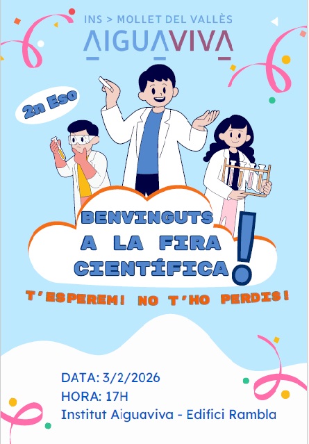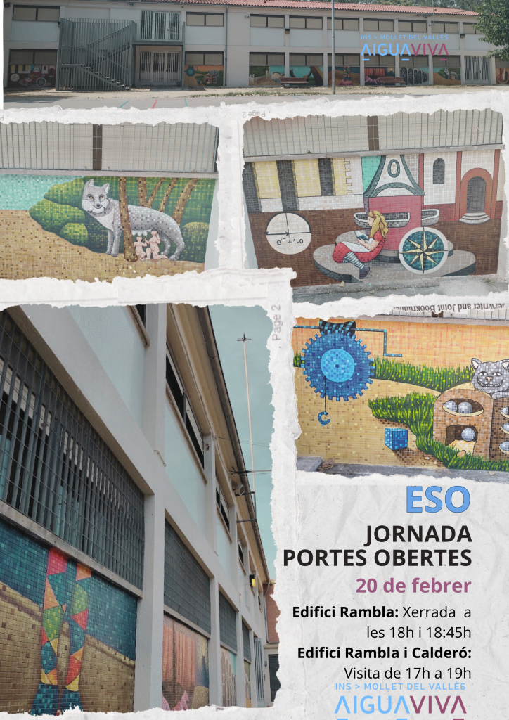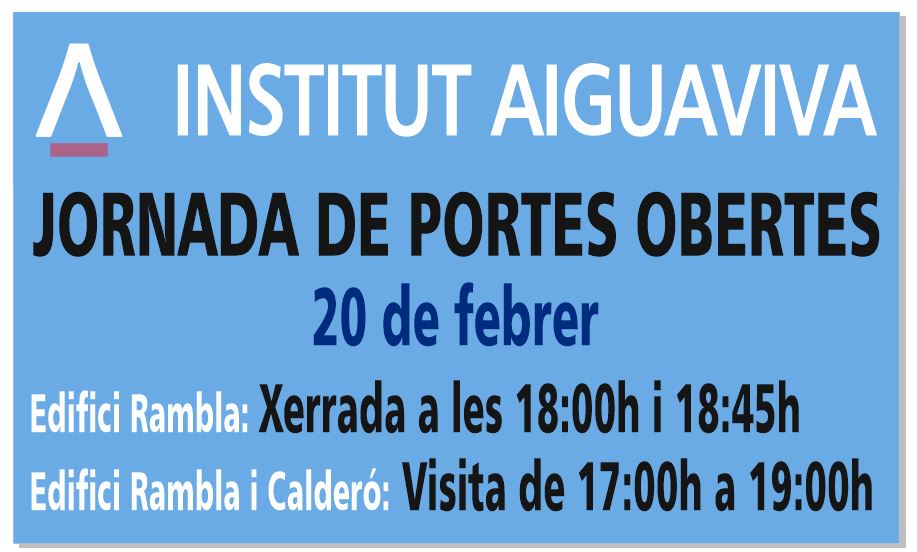 ![]() Les portes obertes de l´ESO de l’Institut Aiguaviva seran el divendres, 20 de febrer. El nostre centre està format per dos edificis. A l’edifici Calderó s’hi imparteixen 1r i 2n d’ESO, mentre que a l’edifici Rambla s’hi fan 3r i 4t d’ESO i 1r i 2n de Batxillerat. Volem que pugueu conèixer tots dos espais i, per aquest motiu, de 17:00 a 19:00 podreu visitar les instal·lacions de l’edifici Calderó, on us mostrarem diferents projectes i activitats del centre a diverses aules. La visita a l´edifici Calderó ha de ser prèvia a xerrades ja que després es fa fosc i no es poden veure prou bé les instal·lacions externes. Cal que us inscriviu a una de les dues xerrades que tindran lloc a l’edifici Rambla, a la Sala d’Actes, on es presentarà el Projecte de Centre. Abans o després de la xerrada, també es farà una visita per l’edifici Rambla i per altres aules, on es mostraran projectes i activitats diferents dels que es poden veure al Calderó. Durant les portes obertes es faran dos torns per assistir a la xerrada informativa que tindrà lloc a l’edifici Rambla (Rambla Pompeu Fabra, 1) a les hores següents: