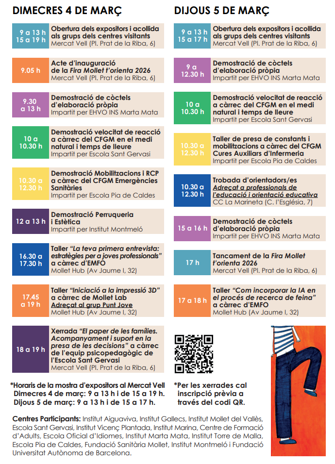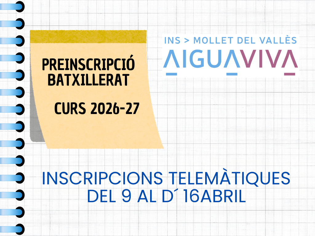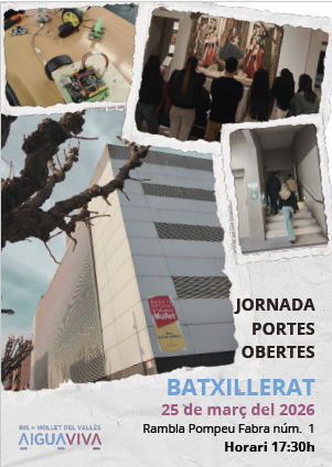 Per tal de saber l’aforament de les xerrades, us demanem que us inscrigueu a l’horari que us vagi millor. Podeu inscrivir-vos a través del següent enllaç: FORMULARI INSCRIPCIÓ PORTES OBERTES 2026 A les dues seus hi haurà aules mostrals preparades pels professors dels departaments i alumnes per ensenyar les tasques que es realitzen a les diferents matèries i als Projectes de Centre. A la pg web del centre a REVISTA pot veure un tastet de totes les activitats d´aquest curs mirant les notícies o filtrant per activitats, sortides o matèries. A l´apartat de PORTES OBERTES de la web anirem actualitzant la informació referent a les Portes Obertes amb material preparat per aquell dia com vídeos, presentacions o díptics. Us hi esperem! Informació preinscripció curs 2026-2027 ( Pendent d´actualització per part del Departament ) CALENDARI DE PREINSCRIPCIONS: -Educació secundària obligatòria* del 6 al 18 de març de 2026 -Batxillerat del 9 al 16 d’abril de 2026 ![]() LES PORTES OBERTES DE BATXILLERAT ES REALITZARAN EL 20 DE MARÇ A LES 17:00 a l´EDIFICI RAMBLA ( Properament penjarem més informació ) |